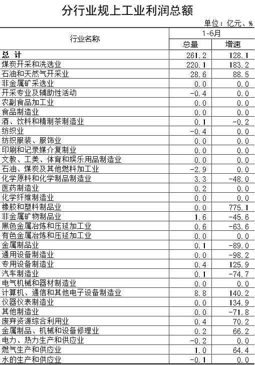 从主导行业看:1-6月份,煤炭行业实现利润总额220.1亿元,同比增长183.2%;煤层气行业实现利润总额29.2亿元,增长90.5%;装备制造业实现利润总额9.4亿元,增长84.8%;冶铸行业实现利润总额0.6亿元,同比下降63.6%;化工行业实现利润总额0.4亿元,下降95.6%;电力行业实现利润总额321.6万元,同比下降99.1%。