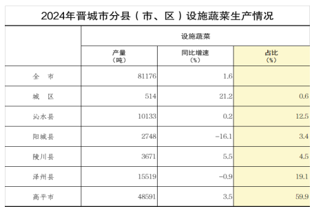 2024年,我市设施蔬菜产量81176吨,同比增长1.6%。