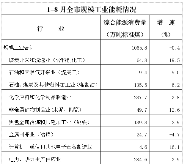 1-8月份,全市规模工业综合能源消费量累计1065.8万吨标准煤,同比下降0.4%。煤炭及主要耗能行业“五升四降”,其中, 计算机、通信和其他电子设备制造业增长16.1%;石油和天然气开采业增长9.0%;电力、热力生产和供应业增长3.9%;化学原料和化学制品制造业增长3.8%;黑色金属冶炼和压延加工业增长2.9%;煤炭开采及洗选业下降19.5%(受兰花科创新材料6月停产影响);非金属矿物制品业下降12.6%(受山水水泥等企业错峰生产影响);石油、煤炭及其他燃料加工业下降6.2%(受华昱化工3月停产影响);金属制品业下降4.7%(见下表)。