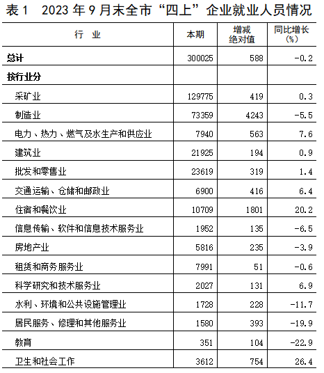 9月末,全市“四上”企业就业人员300025人,同比减少588人,下降0.2%,增量比上年同期(-2040人)增加1452人,增速较上年同期(-0.7%)提高0.5个百分点。