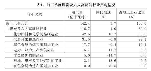 作为工业经济的晴雨表,前三季度全市规上工业用电量142.4亿千瓦时,同比增长3.7%,整体用电平稳增长。从重点行业看,呈现“三升四降”格局,其中,化学原料和化学制品制造业用电量42.6亿千瓦时,同比增长16.7%,贡献率达到119.8%,拉动规上工业用电量增长4.4百分点;石油煤炭加工业和电力热力生产业分别增长13.6%和6.3%。(见表1)