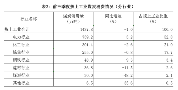 从行业看,电力行业消费759.2万吨(占规上工业的52.8%),同比增长5.2%,增速比上半年减少2.2个百分点;化工行业消费301.4万吨,下降2.6%;炼焦行业消费255.0万吨,下降0.8%;钢铁行业消费48.9万吨,下降9.3%;建材行业消费36.8万吨,下降11.5%;煤炭行业消费30.0万吨,下降48.2%;其他行业6.5万吨,下降35.6%。(见表2)