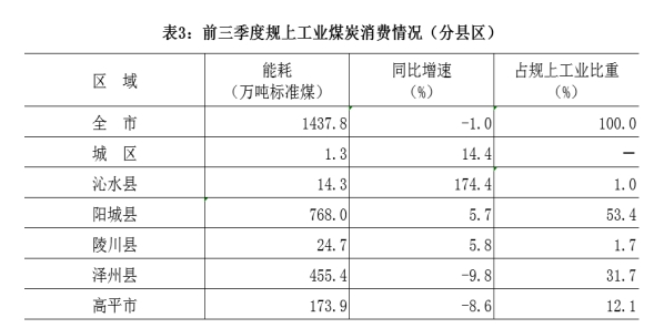 前三季度,全市煤炭消费量1437.8万吨,同比下降1.0%,年内增速由正转负。