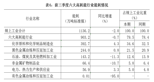 从行业内部结构看,化学原料和化学制品制造业综合能耗392.7万吨标准煤,同比增长4.3%,占规上工业比重34.6%(同比上升2.1个百分点);黑色金属压延加工业244.0万吨标准煤,占比21.5%(上升0.6个百分点);电力热力生产和供应业56.9万吨标准煤,占比5.0%(上升0.2个百分点)。(见表4)