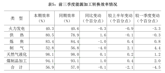 能源加工转换损失量是能耗的重要组成部分。前三季度,全市涉及能源加工转换的企业251家,占规模工业企业数的33.4%,能源加工转换累计投入量796.8万吨标准煤,累计产出量453.2万吨标准煤,加工转换总效率56.9%(扣除原煤入洗损耗),较上半年和一季度分别回落2.1和4.5个百分点。其中,受阳城国际、大唐发电和阳城晋煤能源三家企业安排停检影响,火力发电效率40.3%,较上半年和一季度分别下降0.9和3.3个百分点。(见表5、图3)