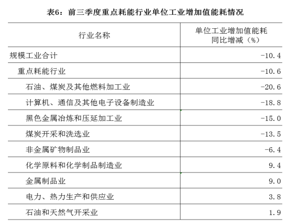 前三季度,全市部分重点行业增加值能耗同比上升。其中,化学原料和化学制品制造业上升9.4%,金属制品业上升9.0%,电力热力生产和供应业上升3.8%,石油和天然气开采业上升1.9%,节能压力向化工和电力等基础行业集中。(见表6)