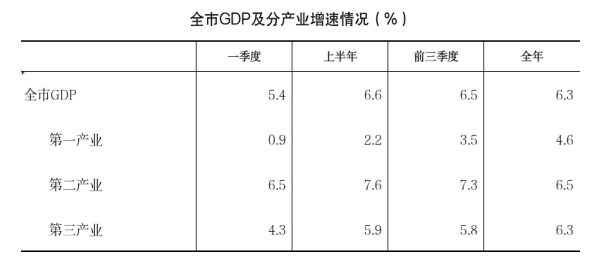在一季度GDP增长5.4%、上半年增长6.6%和前三季度增长6.5%的基础上,全年全市经济运行保持总体平稳、稳中有进的发展态势。根据地区生产总值统一核算结果,全年全市GDP为2429.9亿元,按不变价格计算,比上年同期增长6.3%。分产业看,第一产业增加值78亿元,同比增长4.6%;第二产业增加值1346.1亿元,同比增长6.5%;第三产业增加值1005.9亿元,同比增长6.3%。三次产业增加值占GDP的比重分别为3.2%、55.4%和41.4%。