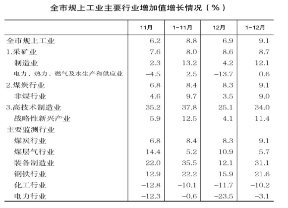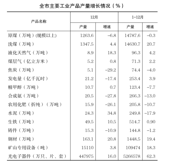 2.工业经济较快增长。产业转型步伐加快,钢铁、铸造、化工等传统产业向高向绿升级,光机电、装备制造业、数字经济等新兴产业聚链成群发展,平台载体能级系统提升,现代化产业体系步伐加快。全年全市规上工业增加值同比增长9.1%。从三大门类看,制造业增长12.1%,采矿业增长8.7%,电力、热力、燃气及水生产和供应业增长0.6%。从煤与非煤看,煤炭工业增长9.1%,非煤工业增长9%。从主要行业看,装备制造业增长31.1%(光机电增长18%),钢铁行业增长21.6%,煤层气行业增长5.7%,电力行业下降3.1%,化工行业下降10.2%。主要产品产量总体平稳,全年全市规上原煤产量14787.6万吨,下降0.3%;煤层气产量71.3亿立方米,增长2.2%。其他主要工业产品中,光电子器件、洗煤高速增长,钢材、矿山专用设备较快增长,液化天然气、发电量产量平稳增长,铸件、焦炭呈负增长。