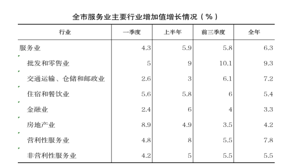 3.服务业回升向好。制定实施服务业提质增效年度行动计划,通过发展壮大平台经济、推进程颢文化产业园等重点项目建设、建成投运物流园区、出台房地产系列稳市政策等多项举措,在房地产、金融服务及交通运输等关键领域精准施策,推动现代服务业体系加快构建。全年全市服务业增加值增长6.3%,比前三季度(5.8%)加快1.5个百分点。其中,批发和零售业增长9.3%,交通运输、仓储和邮政业增长7.2%,住宿和餐饮业增长5.4%,营利性服务业增加值增长7.8%,非营利性服务业增加值增长5.5%,房地产业增长4.2%,金融业增长3.3%。批发和零售业较快增长,交通运输、仓储和邮政业、住宿和餐饮业、营利性服务业、非营利性服务业均呈现稳健增长、活力增强的发展态势。