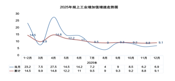 (一)经济稳定向好的根基需进一步巩固。根据全年主要经济指标数据显示,一季度同比增长5.4%,上半年显著回升至6.6%,三季度小幅回调至6.5%,全年累计增速为6.3%,数据呈现明显的增速回落态势,三季度较上半年回落0.1个百分点,全年增速较前三季度回落0.2个百分点,显示经济增长动能呈现前高后低、逐季放缓的特征,持续增长面临压力。根据月度累计数据显示,1-2月规上工业增加值增速达14.5%,实现高位开局,一季度增速明显回落降至9.9%,1-4月累计增速回升至14.8%,但此后呈现持续放缓趋势,下半年增速始终未能突破10%,工业生产增长动能呈减弱态势。