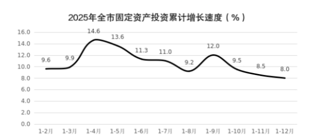 (三)投资增长后劲需进一步增强。固定资产投资呈现增速放缓、结构分化的运行特征,全年全市固定资产投资同比增长8.0%,增速较1-11月回落0.5个百分点。从投资主体看,民间投资增速由12.0%回落至9.4%,市场主体投资意愿有所减弱。值得关注的是,科技创新相关行业投资大幅收缩,科学研究和技术服务业投资增速回落53个百分点,信息传输、软件和信息技术服务业投资增速回落23.1个百分点,反映新兴动能培育面临短期挑战。在房地产投资持续探底、民间投资活力不足、新兴领域支撑减弱的叠加影响下,全市投资增长的内生动力亟待加强。