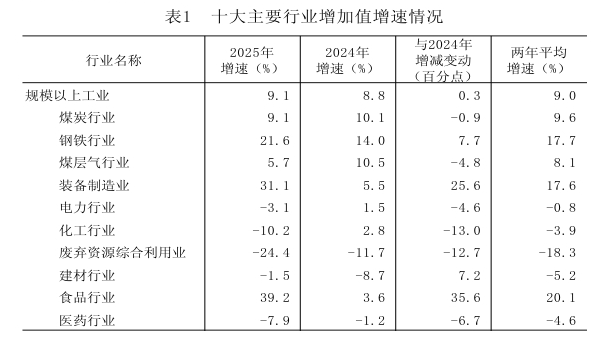 2025年,全市33个工业大类行业中,18个行业增加值同比实现增长,增长面达55%;12个行业增加值增速较2024年有所回升(或降幅收窄),回升面36%。十大主要行业增加值增速呈现“五增五降”态势,合计占规上工业的比重99.1%,对规上工业增长的贡献率达99.6%,有力支撑全市工业经济平稳运行。其中,食品、装备制造和钢铁行业实现两位数增长,分别增长39.2%、31.1%、21.6%;煤炭和煤层气行业实现较快增长,增速分别为9.1%、5.7%,五大增长行业合计拉动规上工业增加值增长10.0个百分点。与2024年相比,十大主要行业增加值增速呈“四升六降”,其中食品、装备制造和钢铁行业分别加快35.6个、25.6个和7.7个百分点,建材行业降幅收窄7.2个百分点。详见表1。