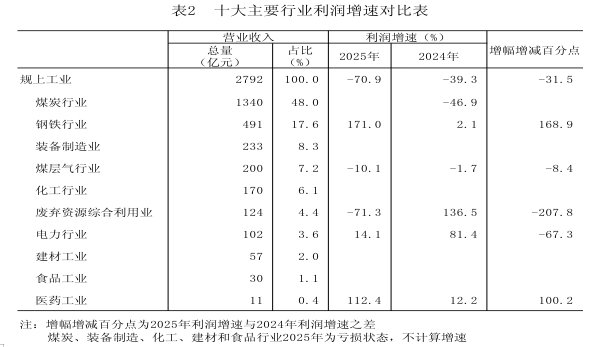 2025年,规上工业企业实现营业收入2792.3亿元,同比下降9.6%,年内降幅持续扩大;规上工业企业实现利润48.6亿元,下降70.9%,与2024年相比,降幅扩大31.5个百分点。列统的32个大类行业中,18个行业利润同比增长,增长面56.3%,较2024年提高7.8个百分点;15个行业利润较2024年增速回升(或降幅收窄),回升面46.9%。十大主要行业中,利润总额增速“五升五降”,钢铁、医药、电力等行业利润同比分别增长171.0%、112.4%、14.1%,建材、食品等行业亏损额较上年同期分别减少0.5亿元、0.4亿元,合计拉动规上工业利润增长6.1个百分点;煤层气、废弃资源综合利用等行业利润同比分别下降10.1%、71.3%,煤炭行业近十年以来首次出现亏损,化工、装备制造等行业亏损额较上年同期分别扩大0.1亿元、3.2亿元,合计影响规上工业利润下降76.8个百分点。