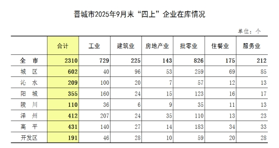 截至2025年9月末,全市“四上”企业法人单位达到2310家,同比增长2.2%。
