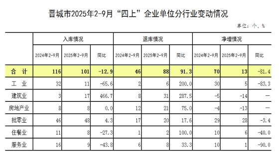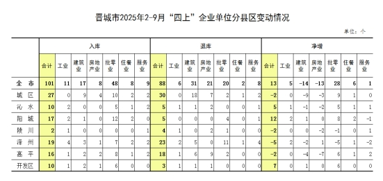 2025年2-9月,全市“四上”企业法人单位入库101家,退库88家,净增13家。